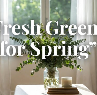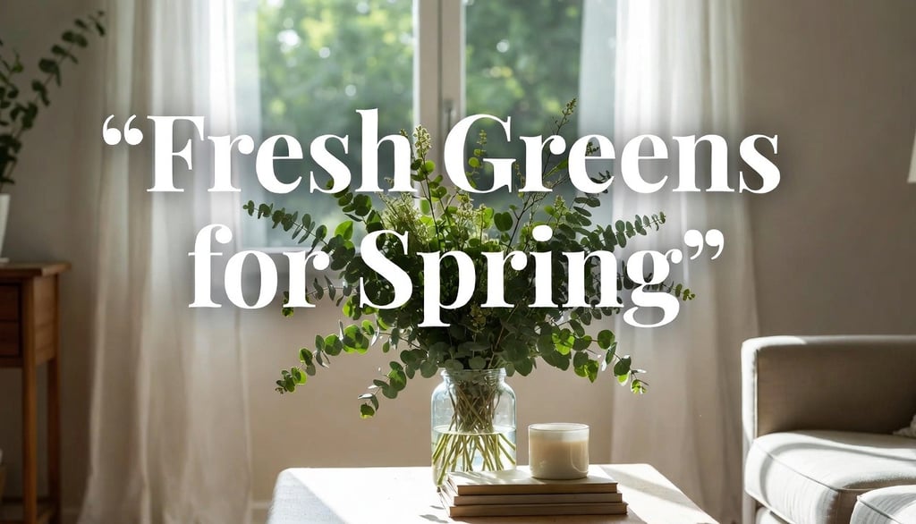Picture This: Close-up of a ceramic vase with mixed greenery—light eucalyptus, deep magnolia leaves, and soft fern—on a neutral console, bright daylight, high-end spring aesthetic, no text.