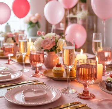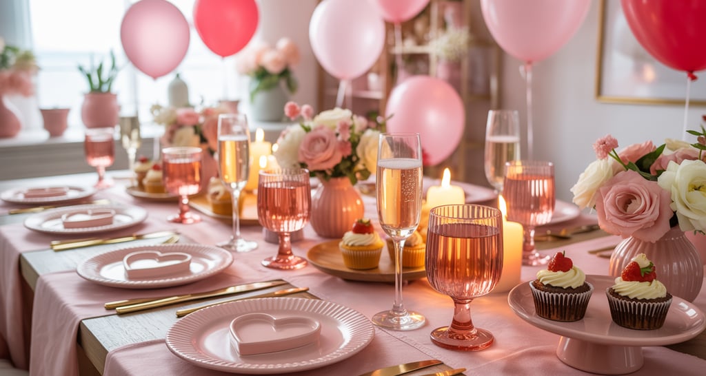 A dining table dressed in soft pink linens, heart-shaped plates stacked neatly, blush candles glowing, and balloon clusters floating overhead while sunlight filters through the room.